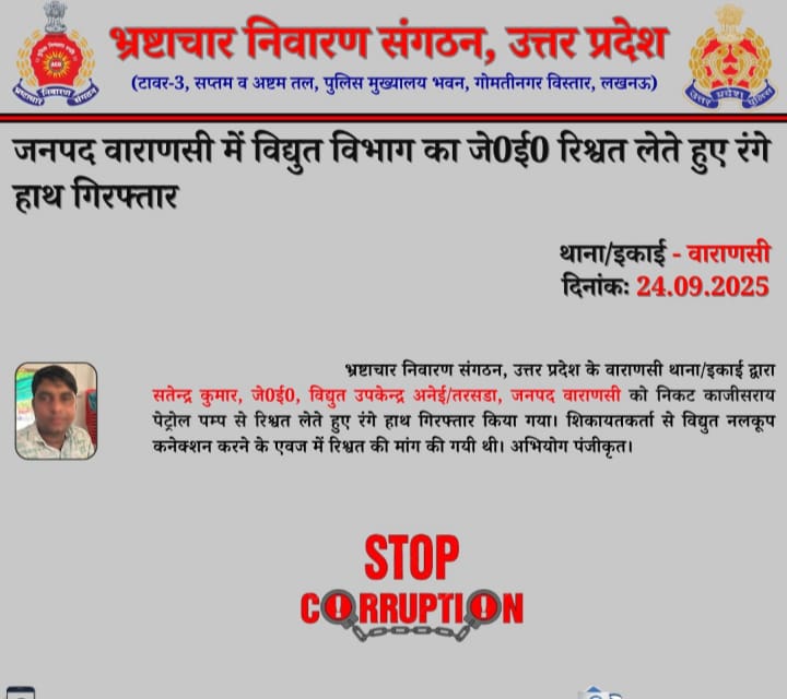 जानकारी के अनुसार, शिकायतकर्ता ने आरोप लगाया था कि जेई सत्येंद्र कुमार वर्मा ने विद्युत नलकूप कनेक्शन देने के एवज में रिश्वत की मांग की थी। इसी शिकायत के आधार पर भ्रष्टाचार निवारण संगठन ने जाल बिछाया और वाराणसी के काजीसराय पेट्रोल पंप के पास से आरोपी जेई को पकड़ लिया।